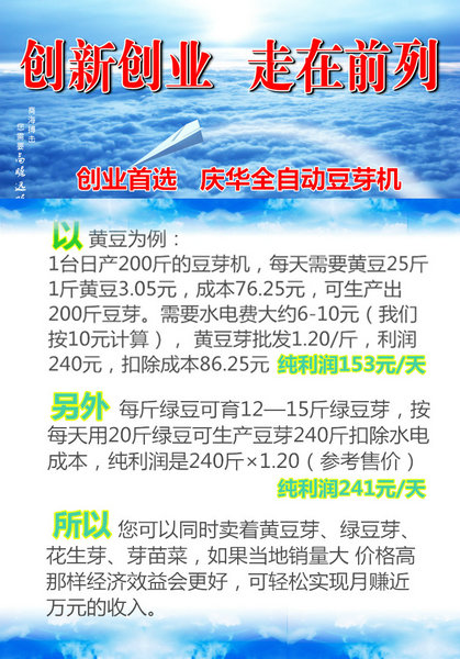 1)我公司生產(chǎn)的全自動(dòng)綠色無污染豆芽機(jī),是現(xiàn)代技術(shù)與傳統(tǒng)工藝的結(jié)合。豆芽機(jī)通過微電腦自動(dòng)控溫、自動(dòng)加溫、自動(dòng)顯示溫度、自動(dòng)淋水,實(shí)現(xiàn)了生產(chǎn)過程的全自動(dòng)化,具有省時(shí)、省工、低耗、無噪音等特點(diǎn)。