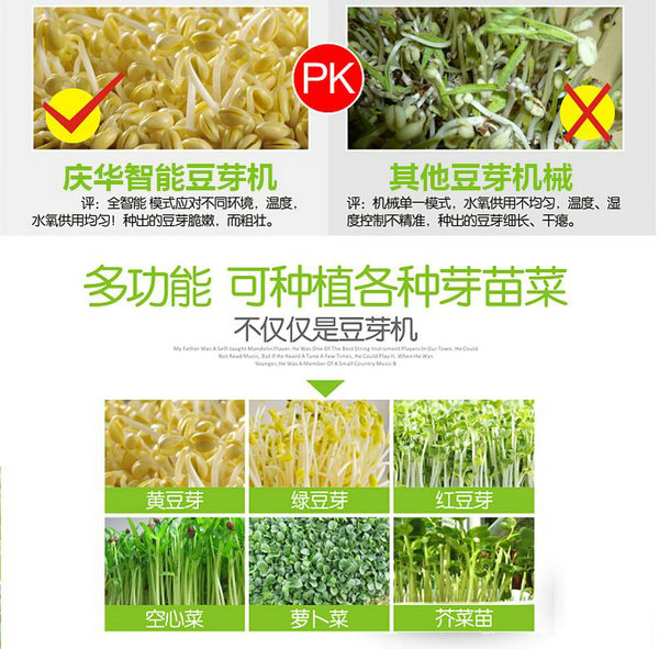 3)我公司豆芽機(jī)生產(chǎn)的豆芽不僅種類多,而且產(chǎn)量高,一斤豆種可生產(chǎn)10斤左右的豆芽。且人工控制的環(huán)境下,豆芽生長(zhǎng)均勻一致,潔白鮮嫩、清脆多汁,口感清爽;不僅食用安全、營(yíng)養(yǎng)豐富,還具有一定的食療保健作用。