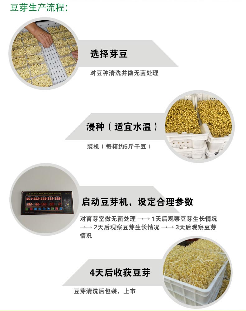 選擇芽豆 →→ 對(duì)豆種清洗并做無菌處理 →→ 浸種(適宜水溫) →→ 裝機(jī)(每箱約5斤干豆) →→ 啟動(dòng)豆芽機(jī),設(shè)定合理參數(shù) →→ 對(duì)育芽室做無菌處理 →→ 1天后觀察豆芽生長(zhǎng)情況 →→ 2天后觀察豆芽生長(zhǎng)情況 →→ 3天后觀察豆芽情況  →→ 4天后收獲豆芽 →→ 豆芽清洗后包裝,上市。