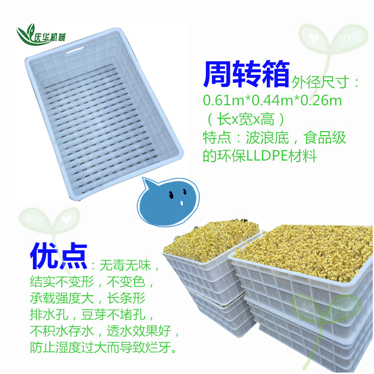 4)周轉箱的外徑尺寸:0.61m*0.44m*0.26m(長寬高),特點:波浪底,食品級的環(huán)保LLDPE材料,無味,結實不變形,不變色,承載強度大,長條形排水孔,豆芽不堵孔,不積水存水,透水效果好,防止?jié)穸冗^大而導致爛牙。