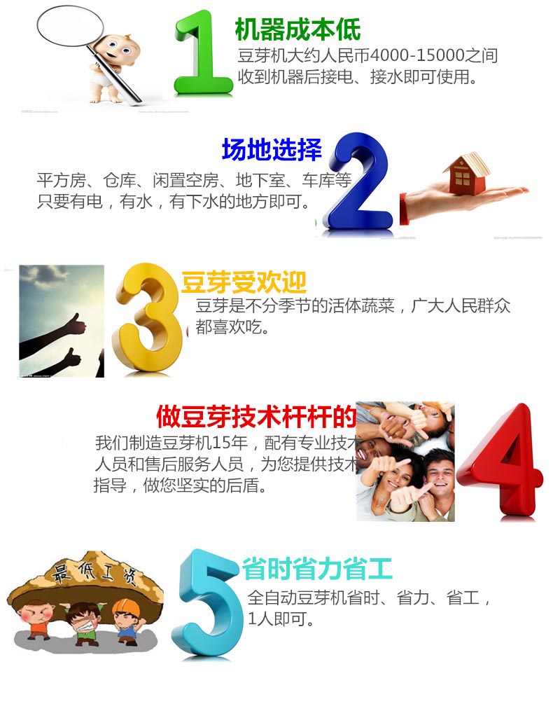 2)用我公司豆芽機生產的豆芽比傳統(tǒng)手工生產周期短質量好,一般手工生產豆芽的周期,夏季需4-5天,冬季需要7-8天,而豆芽機生產豆芽只要3-4天即可,且不受地理環(huán)境、氣候條件和季節(jié)的影響。