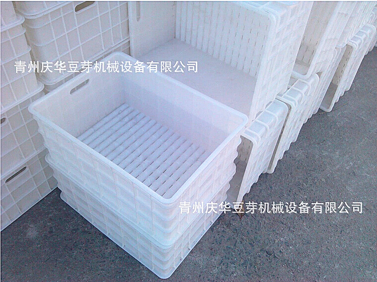 2、主要用途: 廣泛適用于大型戶 3.豆芽生產流程: 選擇芽豆 →→ 對豆種清洗并做無菌處理 →→ 浸種(適宜水溫) →→ 裝機(每箱約5斤干豆) →→ 啟動豆芽機,設定合理參數(shù) →→ 對育芽室做無菌處理 →→ 1天后觀察豆芽生長情況 →→ 2天后觀察豆芽生長情況 →→ 3天后觀察豆芽情況 →→ 4天后收獲豆芽 →→ 豆芽清洗后包裝,上市。 4、豆芽機制造流程: 5、豆芽機產品特點: 5)減少爛芽現(xiàn)象。豆芽生長的爛芽現(xiàn)象多發(fā)生在培育后的三天左右,由于手工生產豆芽的周期長,易出現(xiàn)爛芽現(xiàn)象,然而采用豆芽機生產,三天左右豆芽已經成熟,可以采收食用,不會有爛芽現(xiàn)象發(fā)生。 6、豆芽機結構特點及功能(可根據(jù)客戶需要訂做): 4)周轉箱的外徑尺寸:0.61m*0.44m*0.26m(長寬高),特點:波浪底,食品級的環(huán)保LLDPE材料,無味,結實不變形,不變色,承載強度大,長條形排水孔,豆芽不堵孔,不積水存水,透水效果好,防止?jié)穸冗^大而導致爛牙。 7、價格:價格即可購得